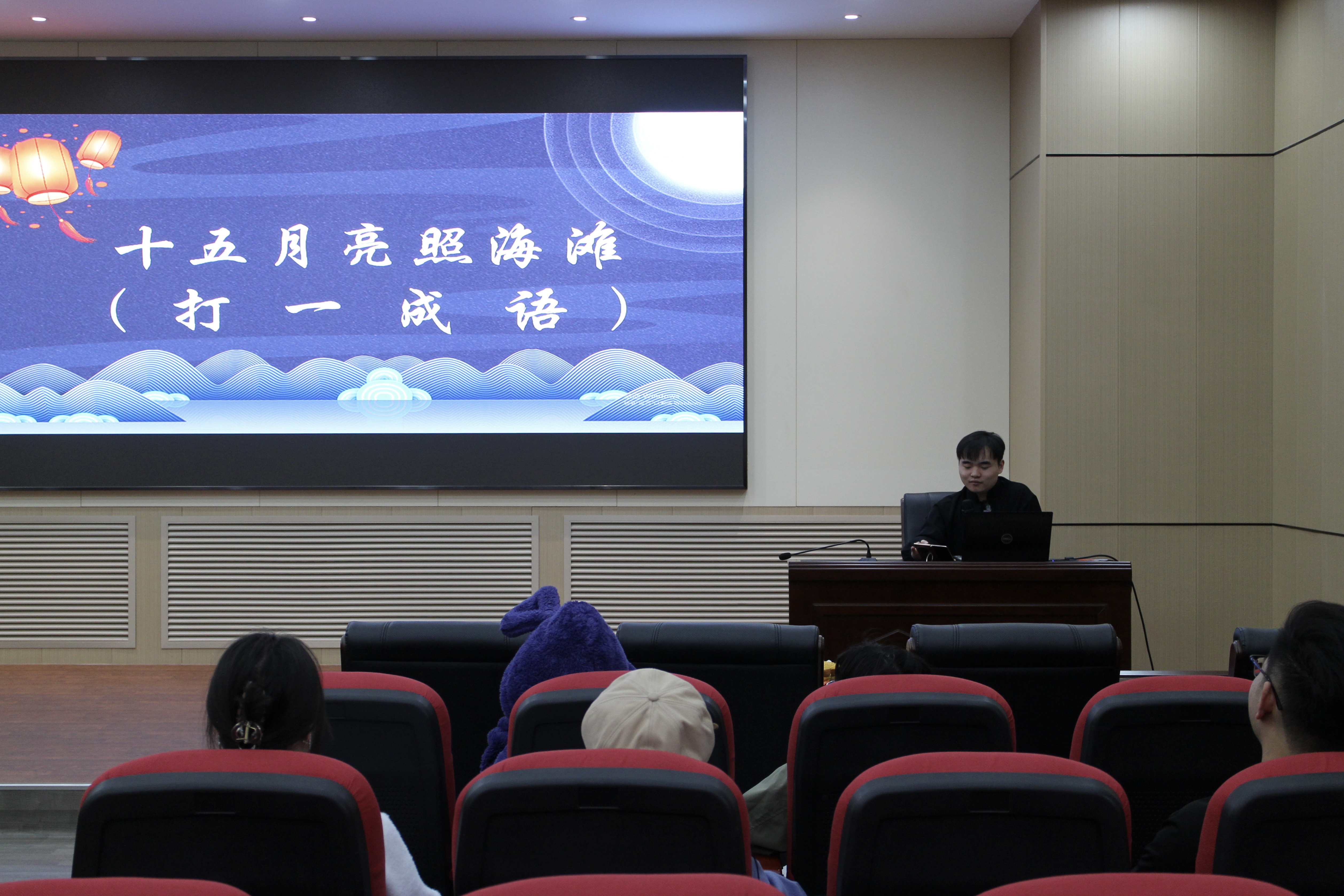 击鼓传月饼环节将活动推向一个小高潮。随着音乐声起,一份象征团圆的月饼玩偶在同学们手中快速传递。节奏暂停时,传递的月饼为同学们带来猜谜机会,也带动起了欢快的活动气氛。
